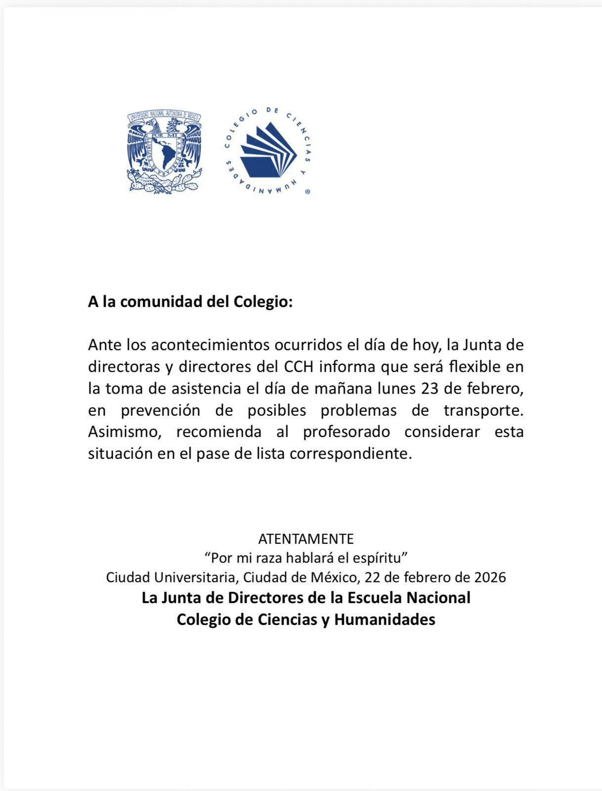 Por su parte, la Junta de Directoras y Directores del Colegio de Ciencias y Humanidades (CCH) emitió un aviso a su comunidad estudiantil y docente. En el comunicado, se estableció que habrá flexibilidad en la toma de asistencia durante la jornada del lunes 23 de febrero, como medida preventiva ante posibles complicaciones en el servicio de transporte.